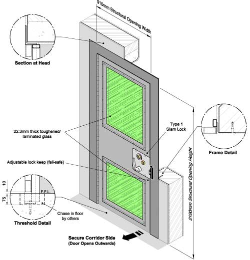 • Glass retaining frames are fitted on the corridor side of the door only.