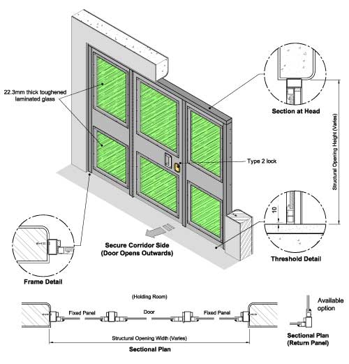 • All glazing is 22.3mm thick toughened laminated glass, the glass retaining frames are only fitted to the corridor side.