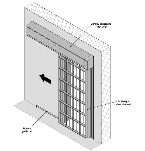 - Steel subframe fixed to door opening incorporating a full height slam channel and bottom guide rail.