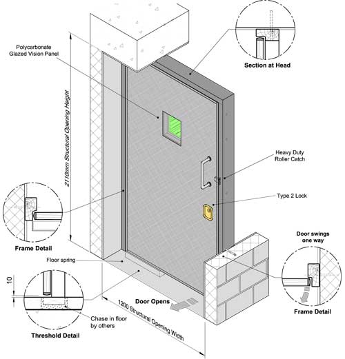 Door is mounted within an Ash frame and pivots on a single action floor spring set into the floor.