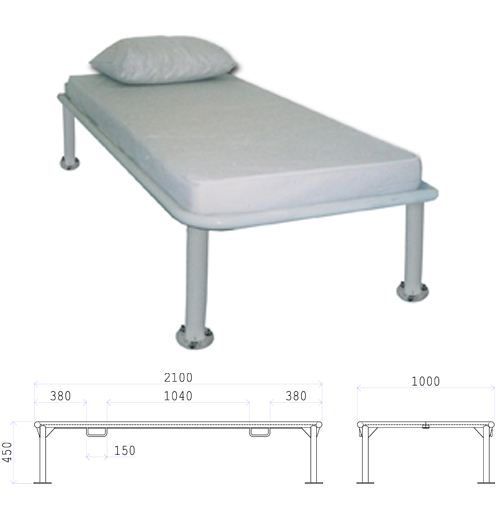 Bed is constructed from a mild steel tube frame with 3mm thick mild steel mattress base complete with ventilation holes and central 50mm wide rolled hollow section stiffener.