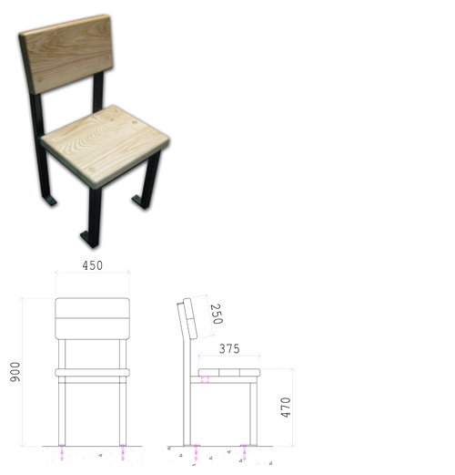 - Chair seating is constructed from 45mm thick Ash battens, mounted on 40 x 40 x 3 RHS framework bolted to floor with heavy duty expansion bolts.