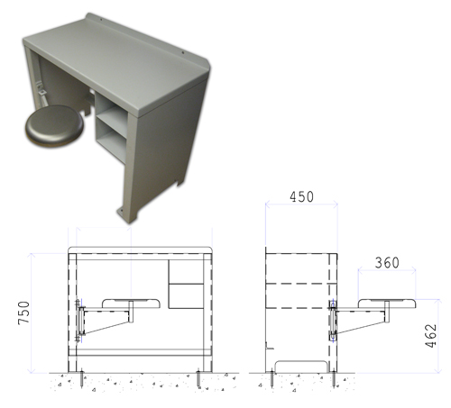 - A robust steel cell desk incorporating a swivel stool and shelves suitable for use in prison cells.
