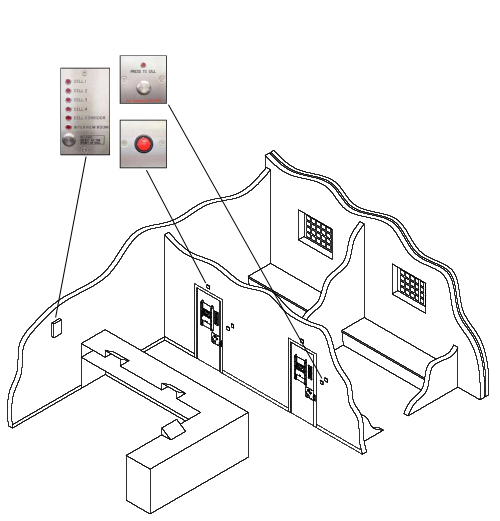 A cell call system ideal for smaller applications where a simple solution is required. The cell inmate can notify the custody desk of a request at the touch of a button. The call button, located within the cell, activates a continuous buzzer once pressed and illuminates a red indicator light on a control panel on the custody desk and over the cell door. The custody officer can make an immediate response ensuring the welfare of the inmate. The system is de-activated and reset by the attending officer by pressing a button adjacent to the cell door. Used in Police Stations, Magistrates Courts, Crown Courts, and HM Armed Forces.
